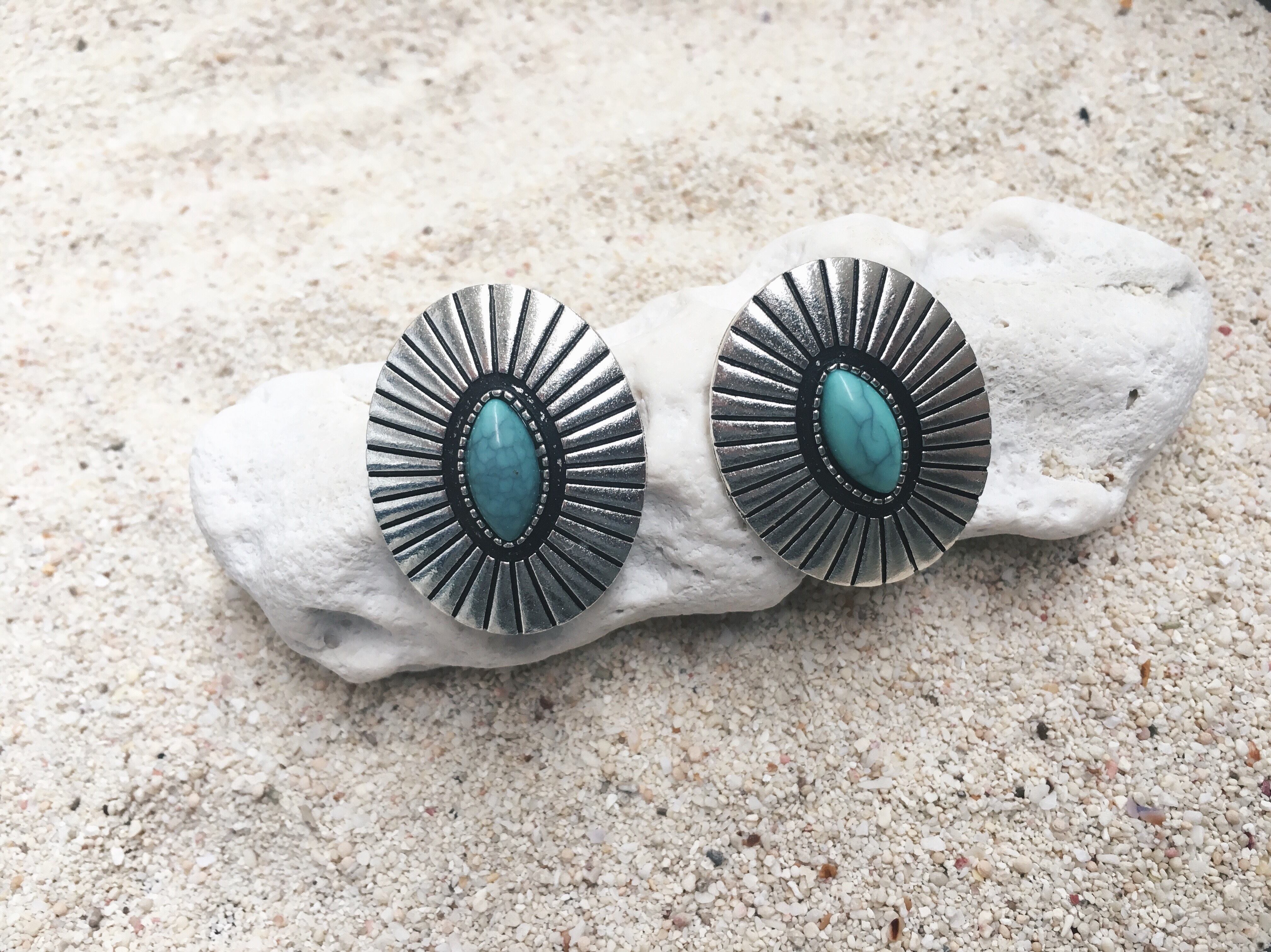お問い合わせ多数のオーバルタイプのターコイズコンチョを使用したインディアンピアス。